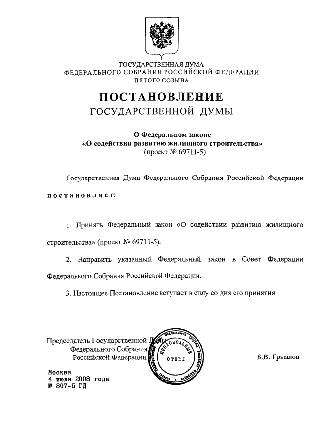 ПОСТАНОВЛЕНИЕ ГД ФС РФ от 04.07.2008 N 807-5 ГД
