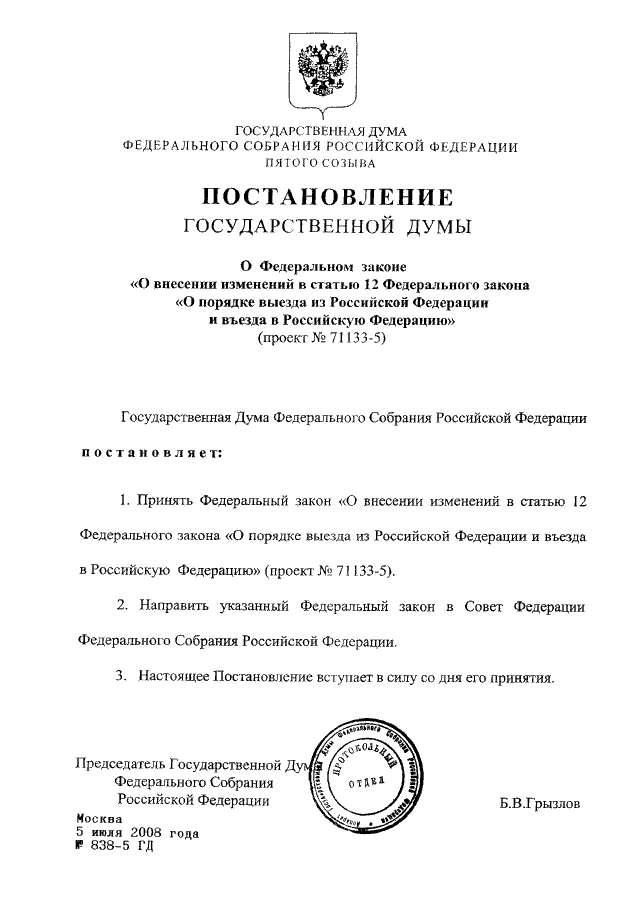 ПОСТАНОВЛЕНИЕ ГД ФС РФ от 05.07.2008 N 838-5 ГД