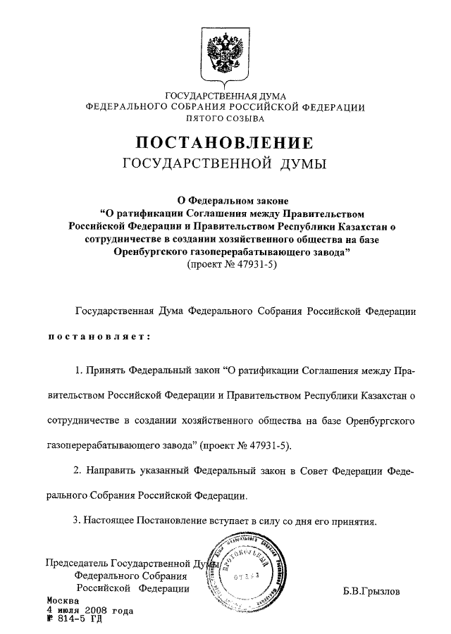 ПОСТАНОВЛЕНИЕ ГД ФС РФ от 04.07.2008 N 814-5 ГД