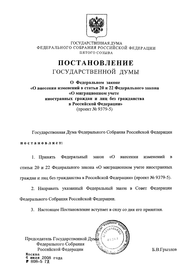 ПОСТАНОВЛЕНИЕ ГД ФС РФ от 04.07.2008 N 808-5 ГД