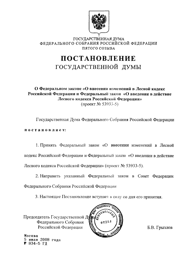 ПОСТАНОВЛЕНИЕ ГД ФС РФ от 05.07.2008 N 834-5 ГД