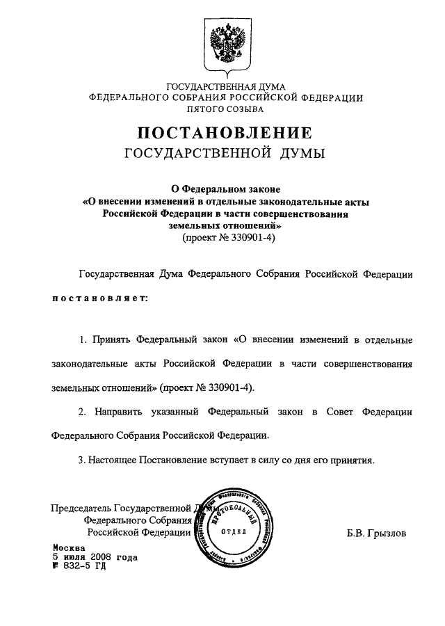 ПОСТАНОВЛЕНИЕ ГД ФС РФ от 05.07.2008 N 832-5 ГД