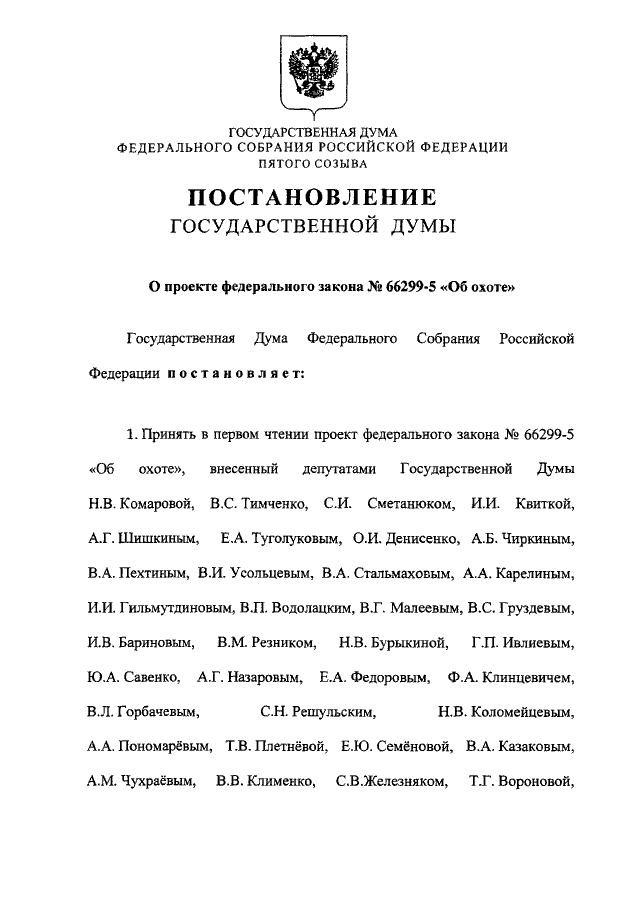 "О ПРОЕКТЕ ФЕДЕРАЛЬНОГО ЗАКОНА N 66299-5 "ОБ ОХОТЕ"