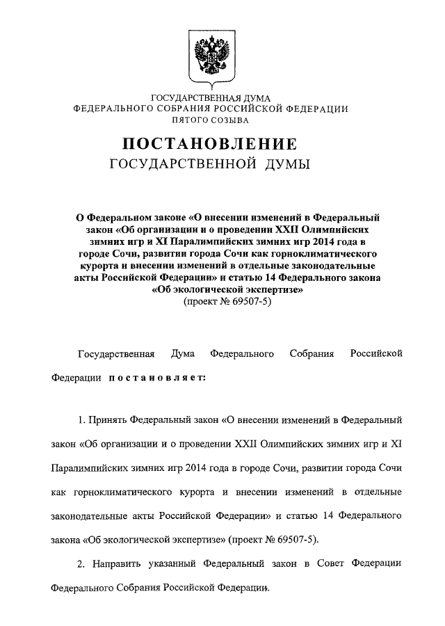 "О ФЕДЕРАЛЬНОМ ЗАКОНЕ "О ВНЕСЕНИИ ИЗМЕНЕНИЙ В ФЕДЕРАЛЬНЫЙ ЗАКОН "ОБ ОРГАНИЗАЦИИ И О ПРОВЕДЕНИИ XXII ОЛИМПИЙСКИХ ЗИМНИХ ИГР И XI ПАРАЛИМПИЙСКИХ ЗИМНИХ ИГР 2014 ГОДА В ГОРОДЕ СОЧИ, РАЗВИТИИ ГОРОДА СОЧИ КАК ГОРНОКЛИМАТИЧЕСКОГО КУРОРТА И ВНЕСЕНИИ ИЗМЕНЕНИЙ В ОТДЕЛЬНЫЕ ЗАКОНОДАТЕЛЬНЫЕ АКТЫ РОССИЙСКОЙ ФЕДЕРАЦИИ" И СТАТЬЮ 14 ФЕДЕРАЛЬНОГО ЗАКОНА "ОБ ЭКОЛОГИЧЕСКОЙ ЭКСПЕРТИЗЕ" (ПРОЕКТ N 69507-5)"
