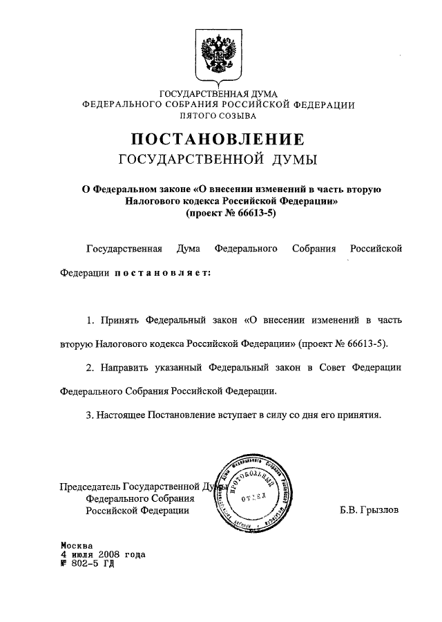 ПОСТАНОВЛЕНИЕ ГД ФС РФ от 04.07.2008 N 802-5 ГД