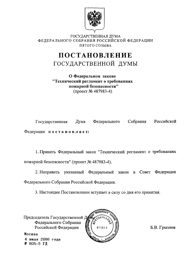 ПОСТАНОВЛЕНИЕ ГД ФС РФ от 04.07.2008 N 805-5 ГД