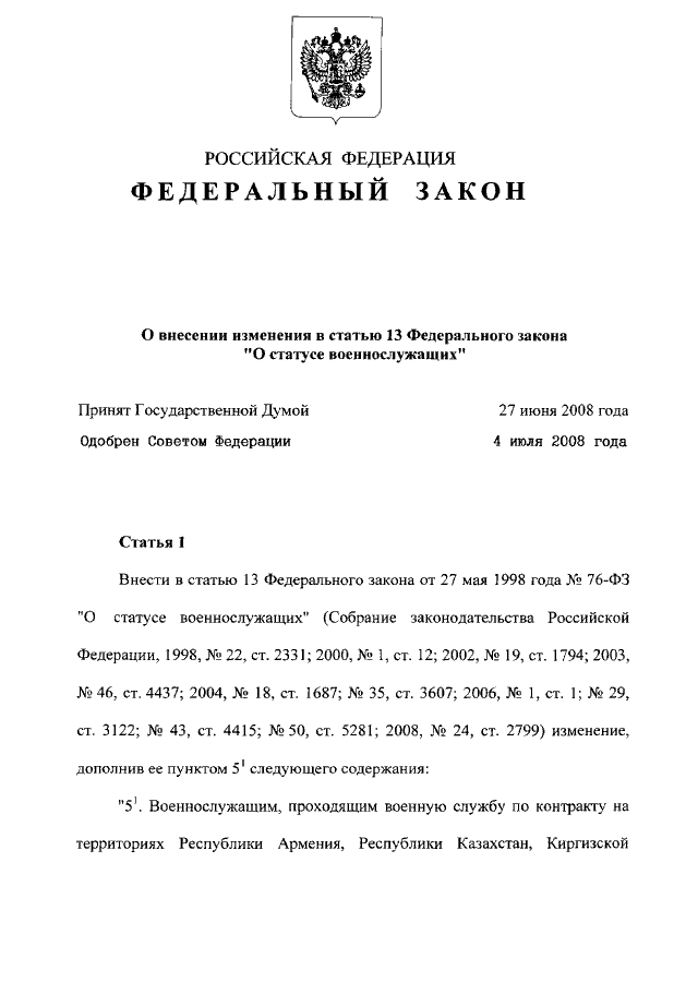 "О ВНЕСЕНИИ ИЗМЕНЕНИЯ В СТАТЬЮ 13 ФЕДЕРАЛЬНОГО ЗАКОНА "О СТАТУСЕ ВОЕННОСЛУЖАЩИХ"