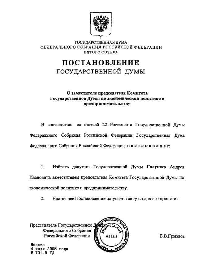 ПОСТАНОВЛЕНИЕ ГД ФС РФ от 04.07.2008 N 791-5 ГД