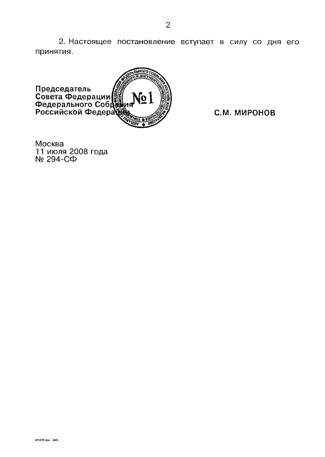 ПОСТАНОВЛЕНИЕ СФ ФС РФ от 11.07.2008 N 294-СФ