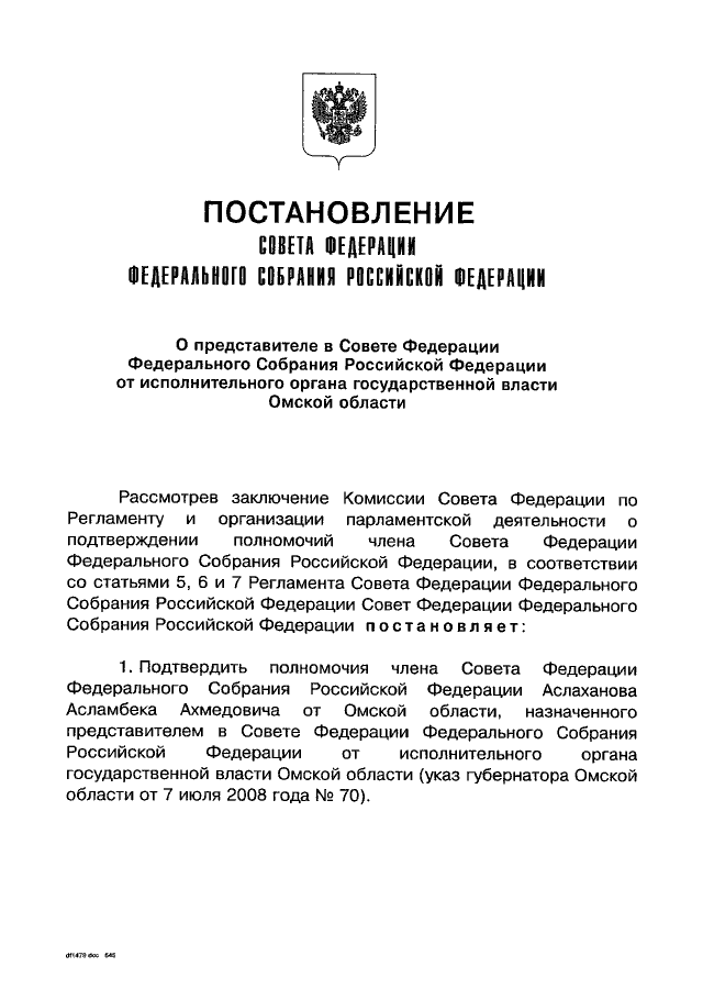 "О ПРЕДСТАВИТЕЛЕ В СОВЕТЕ ФЕДЕРАЦИИ ФЕДЕРАЛЬНОГО СОБРАНИЯ РОССИЙСКОЙ ФЕДЕРАЦИИ ОТ ИСПОЛНИТЕЛЬНОГО ОРГАНА ГОСУДАРСТВЕННОЙ ВЛАСТИ ОМСКОЙ ОБЛАСТИ"