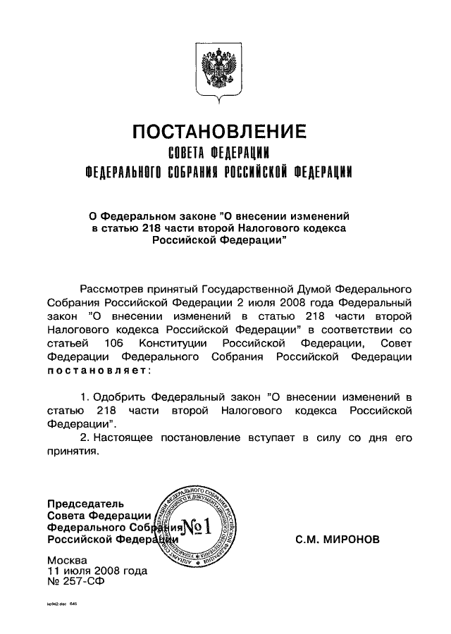 ПОСТАНОВЛЕНИЕ СФ ФС РФ от 11.07.2008 N 257-СФ