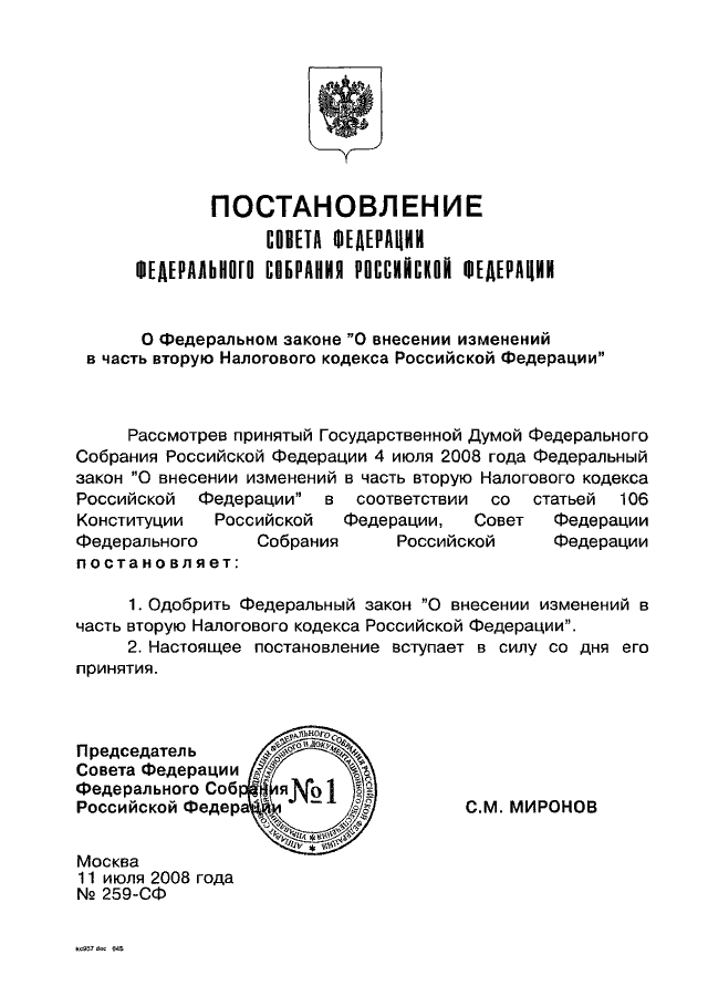 ПОСТАНОВЛЕНИЕ СФ ФС РФ от 11.07.2008 N 259-СФ