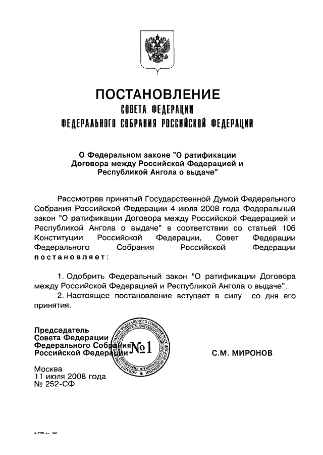 ПОСТАНОВЛЕНИЕ СФ ФС РФ от 11.07.2008 N 252-СФ