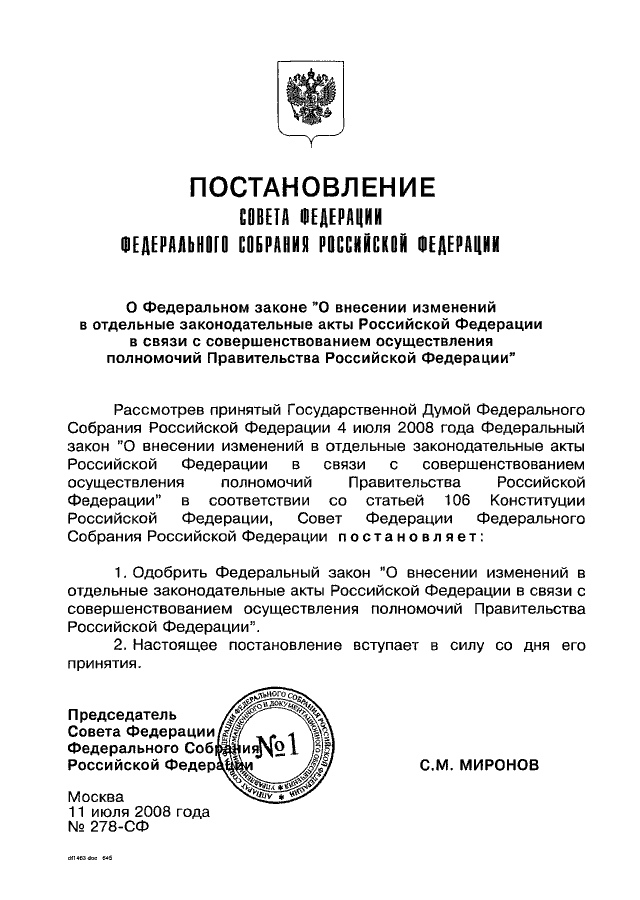 ПОСТАНОВЛЕНИЕ СФ ФС РФ от 11.07.2008 N 278-СФ