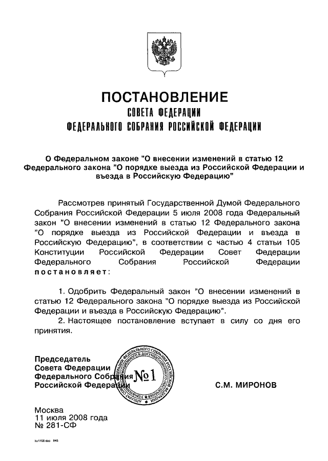 ПОСТАНОВЛЕНИЕ СФ ФС РФ от 11.07.2008 N 281-СФ