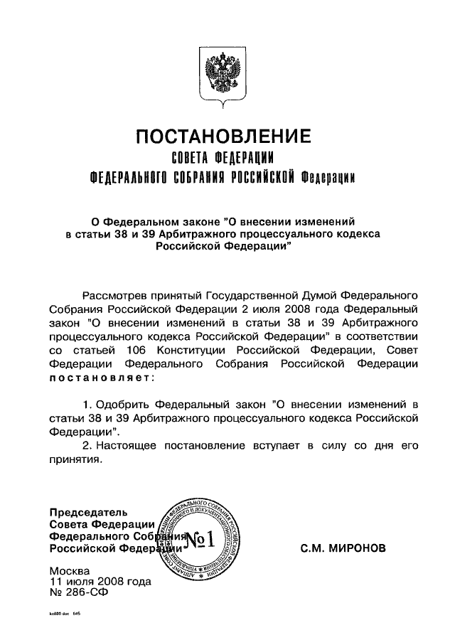 ПОСТАНОВЛЕНИЕ СФ ФС РФ от 11.07.2008 N 286-СФ