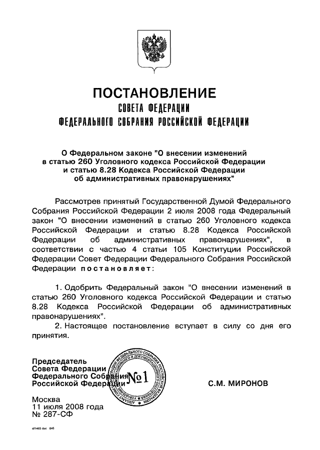 ПОСТАНОВЛЕНИЕ СФ ФС РФ от 11.07.2008 N 287-СФ