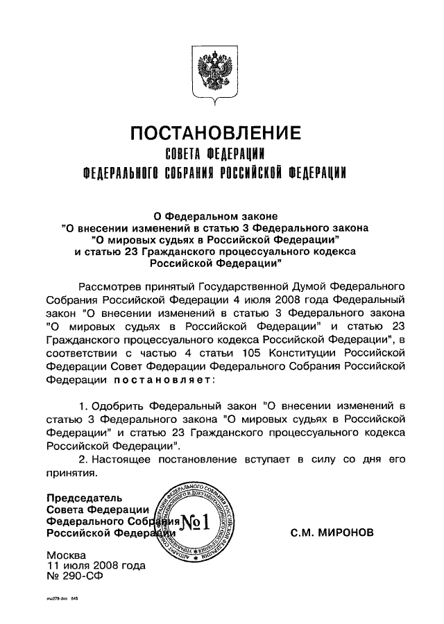 ПОСТАНОВЛЕНИЕ СФ ФС РФ от 11.07.2008 N 290-СФ