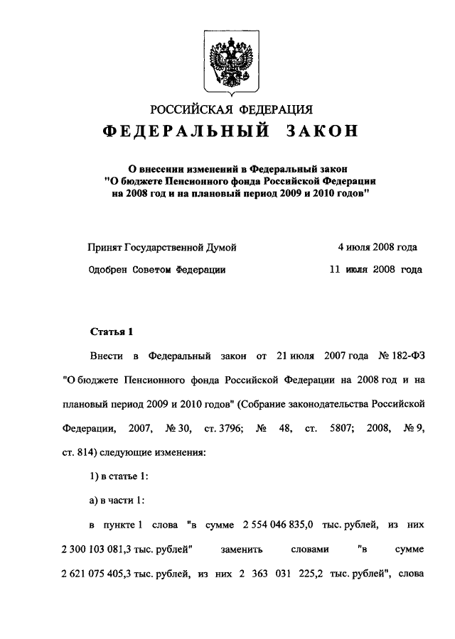 "О ВНЕСЕНИИ ИЗМЕНЕНИЙ В ФЕДЕРАЛЬНЫЙ ЗАКОН "О БЮДЖЕТЕ ПЕНСИОННОГО ФОНДА РОССИЙСКОЙ ФЕДЕРАЦИИ НА 2008 ГОД И НА ПЛАНОВЫЙ ПЕРИОД 2009 И 2010 ГОДОВ"