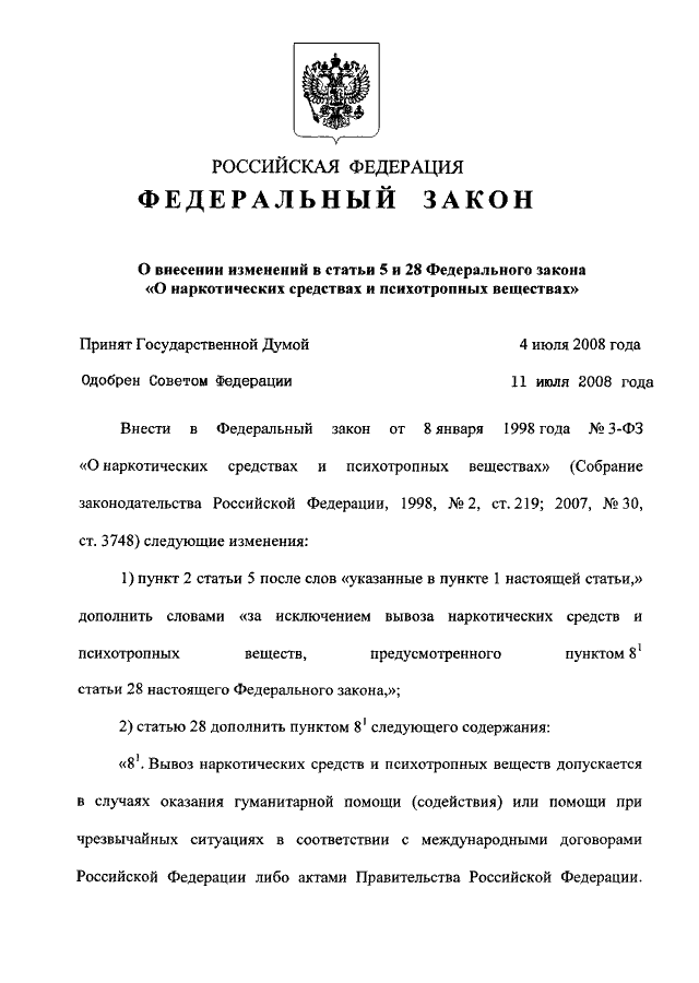 "О ВНЕСЕНИИ ИЗМЕНЕНИЙ В СТАТЬИ 5 И 28 ФЕДЕРАЛЬНОГО ЗАКОНА "О НАРКОТИЧЕСКИХ СРЕДСТВАХ И ПСИХОТРОПНЫХ ВЕЩЕСТВАХ"