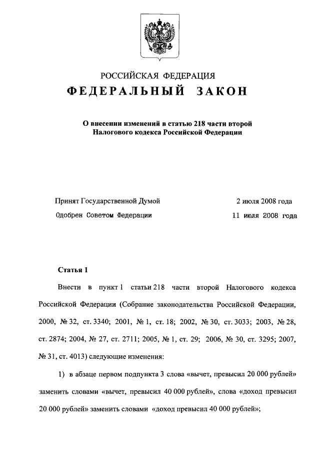 "О ВНЕСЕНИИ ИЗМЕНЕНИЙ В СТАТЬЮ 218 ЧАСТИ ВТОРОЙ НАЛОГОВОГО КОДЕКСА РОССИЙСКОЙ ФЕДЕРАЦИИ"