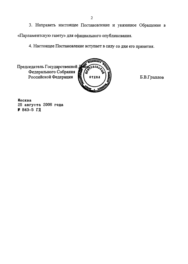 ПОСТАНОВЛЕНИЕ ГД ФС РФ от 25.08.2008 N 843-5 ГД