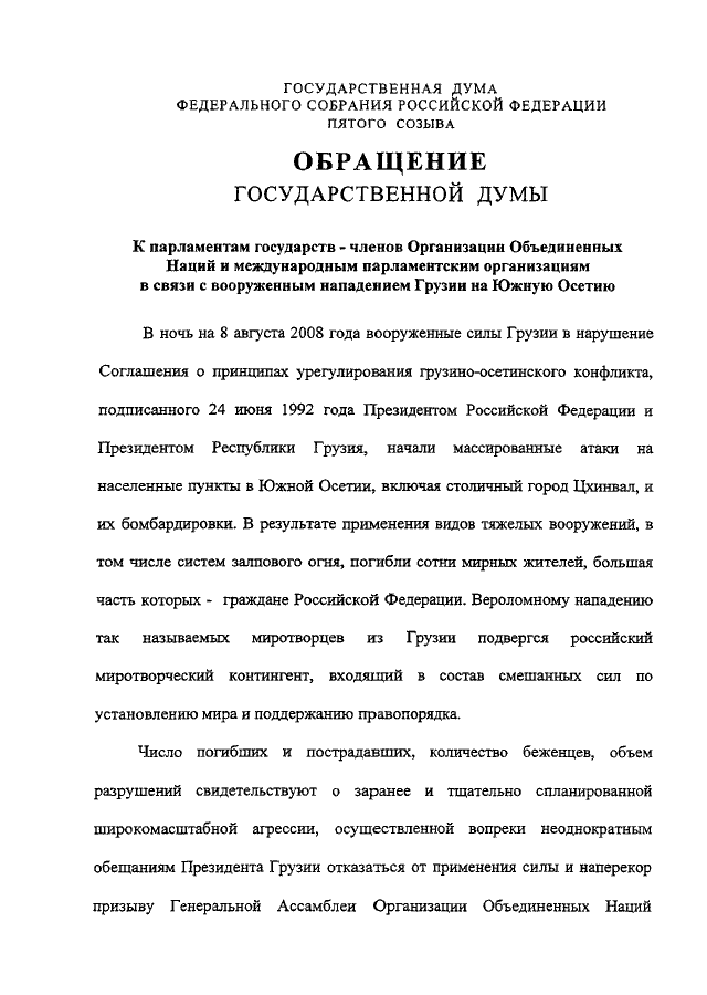 "ОБ ОБРАЩЕНИИ ГОСУДАРСТВЕННОЙ ДУМЫ ФЕДЕРАЛЬНОГО СОБРАНИЯ РОССИЙСКОЙ ФЕДЕРАЦИИ "К ПАРЛАМЕНТАМ ГОСУДАРСТВ - ЧЛЕНОВ ОРГАНИЗАЦИИ ОБЪЕДИНЕННЫХ НАЦИЙ И МЕЖДУНАРОДНЫМ ПАРЛАМЕНТСКИМ ОРГАНИЗАЦИЯМ В СВЯЗИ С ВООРУЖЕННЫМ НАПАДЕНИЕМ ГРУЗИИ НА ЮЖНУЮ ОСЕТИЮ"