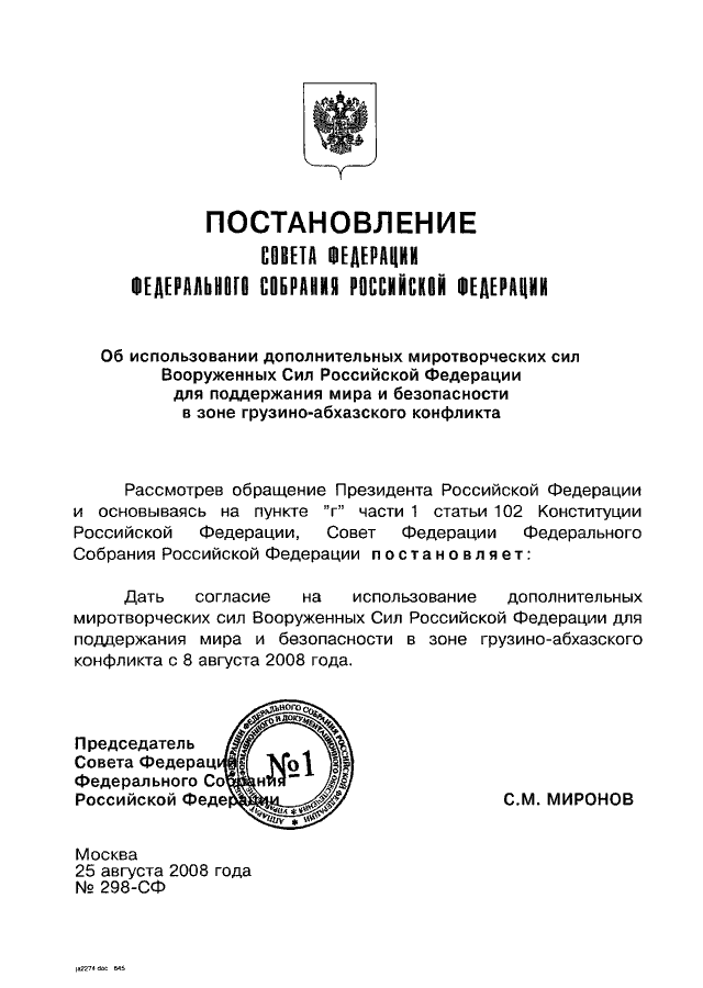 "ОБ ИСПОЛЬЗОВАНИИ ДОПОЛНИТЕЛЬНЫХ МИРОТВОРЧЕСКИХ СИЛ ВООРУЖЕННЫХ СИЛ РОССИЙСКОЙ ФЕДЕРАЦИИ ДЛЯ ПОДДЕРЖАНИЯ МИРА И БЕЗОПАСНОСТИ В ЗОНЕ ГРУЗИНО - АБХАЗСКОГО КОНФЛИКТА"