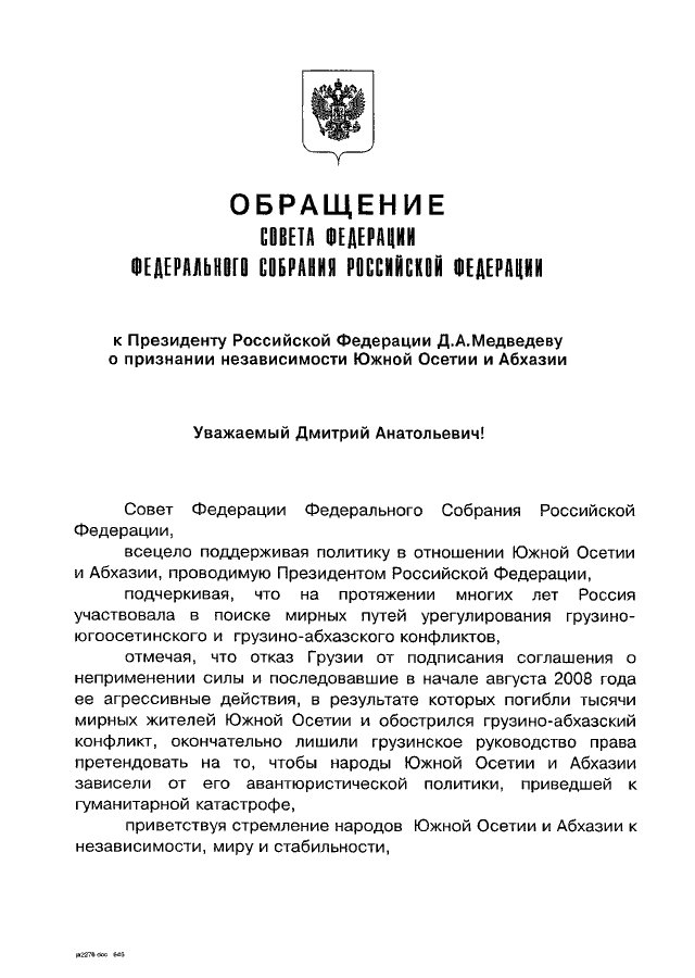 "К ПРЕЗИДЕНТУ РОССИЙСКОЙ ФЕДЕРАЦИИ Д.А. МЕДВЕДЕВУ О ПРИЗНАНИИ НЕЗАВИСИМОСТИ ЮЖНОЙ ОСЕТИИ И АБХАЗИИ"