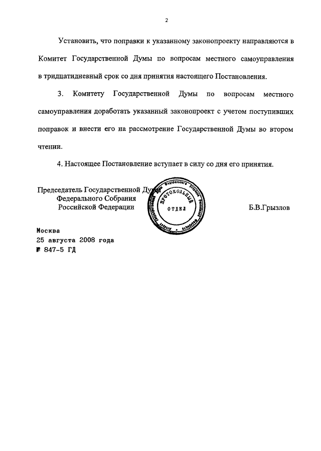 ПОСТАНОВЛЕНИЕ ГД ФС РФ от 25.08.2008 N 847-5 ГД