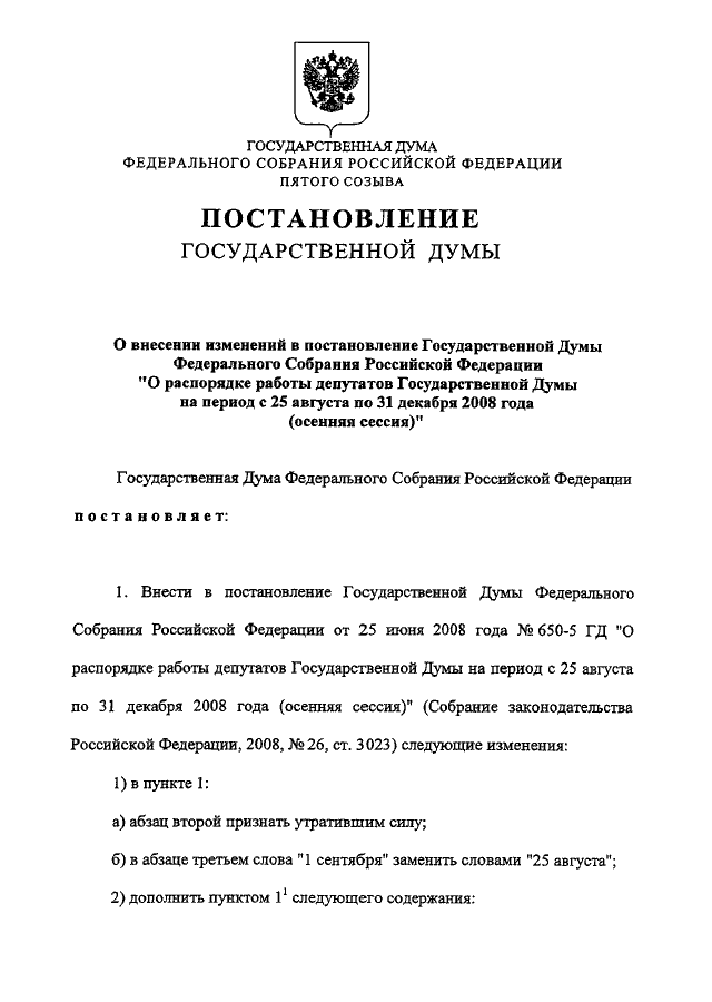 ДЕПУТАТОВ ГОСУДАРСТВЕННОЙ ДУМЫ НА ПЕРИОД С 25 АВГУСТА ПО