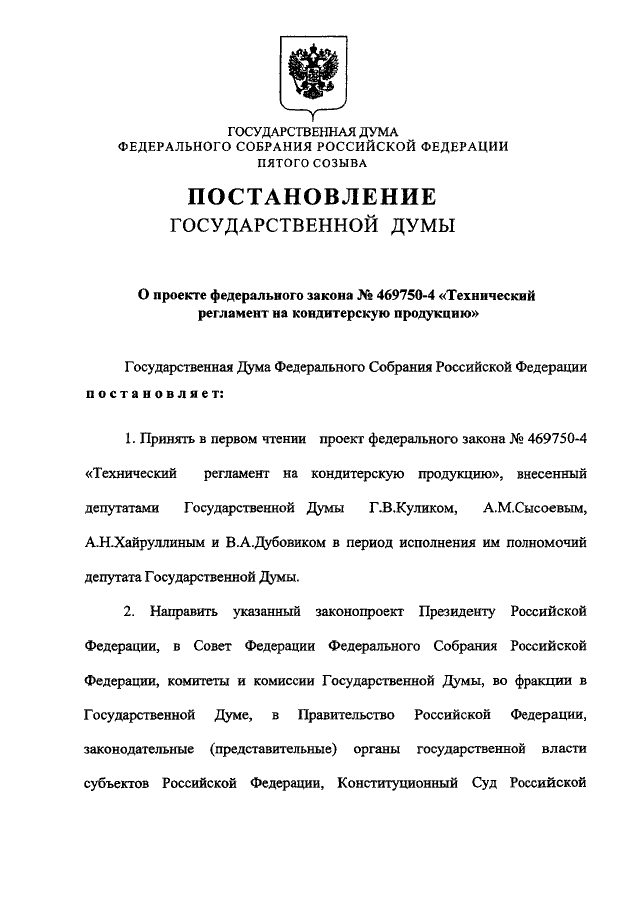 "О ПРОЕКТЕ ФЕДЕРАЛЬНОГО ЗАКОНА N 469750-4 "ТЕХНИЧЕСКИЙ РЕГЛАМЕНТ НА КОНДИТЕРСКУЮ ПРОДУКЦИЮ"