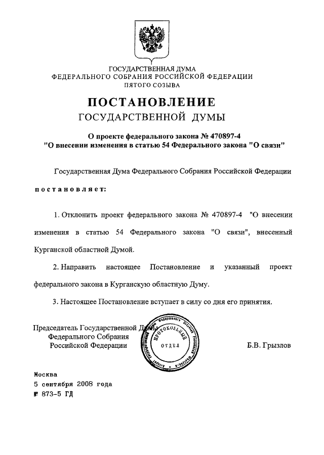 ПОСТАНОВЛЕНИЕ ГД ФС РФ от 05.09.2008 N 873-5 ГД