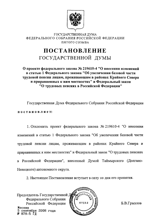 ПОСТАНОВЛЕНИЕ ГД ФС РФ от 05.09.2008 N 878-5 ГД