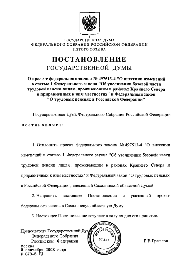 ПОСТАНОВЛЕНИЕ ГД ФС РФ от 05.09.2008 N 879-5 ГД