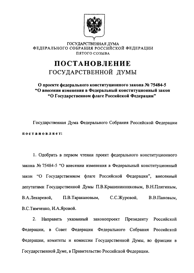 "О ПРОЕКТЕ ФЕДЕРАЛЬНОГО КОНСТИТУЦИОННОГО ЗАКОНА N 75484-5 "О ВНЕСЕНИИ ИЗМЕНЕНИЯ В ФЕДЕРАЛЬНЫЙ КОНСТИТУЦИОННЫЙ ЗАКОН "О ГОСУДАРСТВЕННОМ ФЛАГЕ РОССИЙСКОЙ ФЕДЕРАЦИИ"
