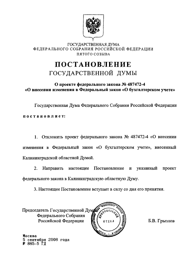 ПОСТАНОВЛЕНИЕ ГД ФС РФ от 05.09.2008 N 885-5 ГД