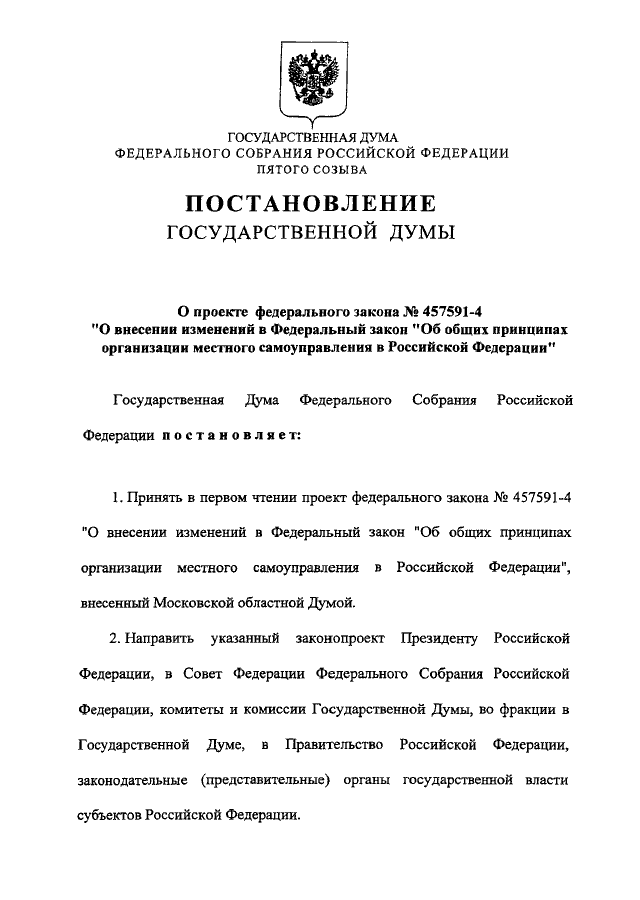 "О ПРОЕКТЕ ФЕДЕРАЛЬНОГО ЗАКОНА N 457591-4 "О ВНЕСЕНИИ ИЗМЕНЕНИЙ В ФЕДЕРАЛЬНЫЙ ЗАКОН "ОБ ОБЩИХ ПРИНЦИПАХ ОРГАНИЗАЦИИ МЕСТНОГО САМОУПРАВЛЕНИЯ В РОССИЙСКОЙ ФЕДЕРАЦИИ"