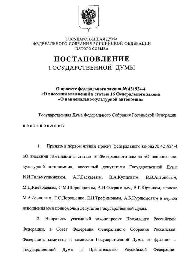 "О ПРОЕКТЕ ФЕДЕРАЛЬНОГО ЗАКОНА N 421924-4 "О ВНЕСЕНИИ ИЗМЕНЕНИЙ В СТАТЬЮ 16 ФЕДЕРАЛЬНОГО ЗАКОНА "О НАЦИОНАЛЬНО - КУЛЬТУРНОЙ АВТОНОМИИ"
