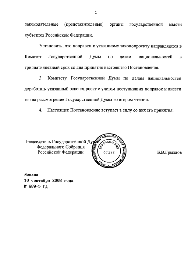 ПОСТАНОВЛЕНИЕ ГД ФС РФ от 10.09.2008 N 889-5 ГД