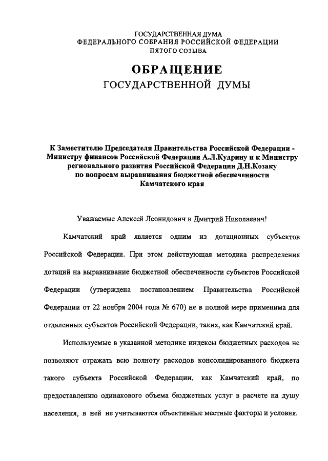 "ОБ ОБРАЩЕНИИ ГОСУДАРСТВЕННОЙ ДУМЫ ФЕДЕРАЛЬНОГО СОБРАНИЯ РОССИЙСКОЙ ФЕДЕРАЦИИ "К ЗАМЕСТИТЕЛЮ ПРЕДСЕДАТЕЛЯ ПРАВИТЕЛЬСТВА РОССИЙСКОЙ ФЕДЕРАЦИИ - МИНИСТРУ ФИНАНСОВ РОССИЙСКОЙ ФЕДЕРАЦИИ А.Л. КУДРИНУ И К МИНИСТРУ РЕГИОНАЛЬНОГО РАЗВИТИЯ РОССИЙСКОЙ ФЕДЕРАЦИИ Д.Н. КОЗАКУ ПО ВОПРОСАМ ВЫРАВНИВАНИЯ БЮДЖЕТНОЙ ОБЕСПЕЧЕННОСТИ КАМЧАТСКОГО КРАЯ"