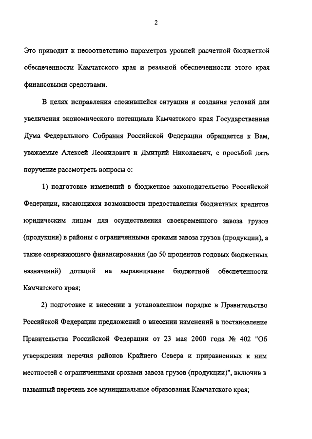 "ОБ ОБРАЩЕНИИ ГОСУДАРСТВЕННОЙ ДУМЫ ФЕДЕРАЛЬНОГО СОБРАНИЯ РОССИЙСКОЙ ФЕДЕРАЦИИ "К ЗАМЕСТИТЕЛЮ ПРЕДСЕДАТЕЛЯ ПРАВИТЕЛЬСТВА РОССИЙСКОЙ ФЕДЕРАЦИИ - МИНИСТРУ ФИНАНСОВ РОССИЙСКОЙ ФЕДЕРАЦИИ А.Л. КУДРИНУ И К МИНИСТРУ РЕГИОНАЛЬНОГО РАЗВИТИЯ РОССИЙСКОЙ ФЕДЕРАЦИИ Д.Н. КОЗАКУ ПО ВОПРОСАМ ВЫРАВНИВАНИЯ БЮДЖЕТНОЙ ОБЕСПЕЧЕННОСТИ КАМЧАТСКОГО КРАЯ"
