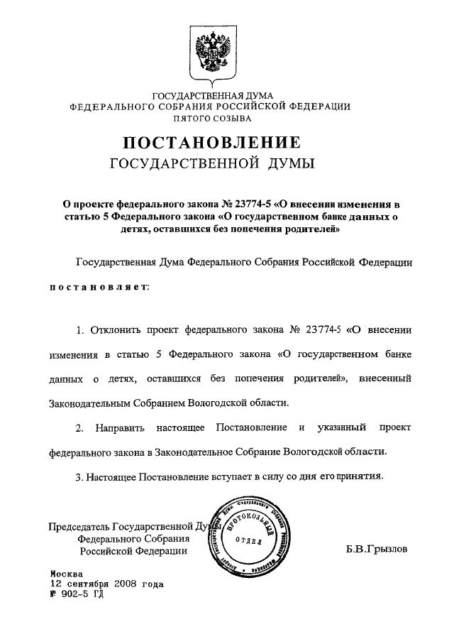 ПОСТАНОВЛЕНИЕ ГД ФС РФ от 12.09.2008 N 902-5 ГД