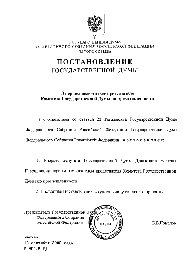 ПОСТАНОВЛЕНИЕ ГД ФС РФ от 12.09.2008 N 892-5 ГД