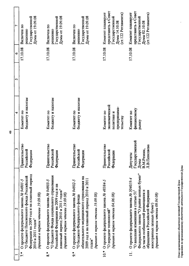 "О КАЛЕНДАРЕ РАССМОТРЕНИЯ ВОПРОСОВ ГОСУДАРСТВЕННОЙ ДУМОЙ С 1 ПО 17 ОКТЯБРЯ 2008 ГОДА"