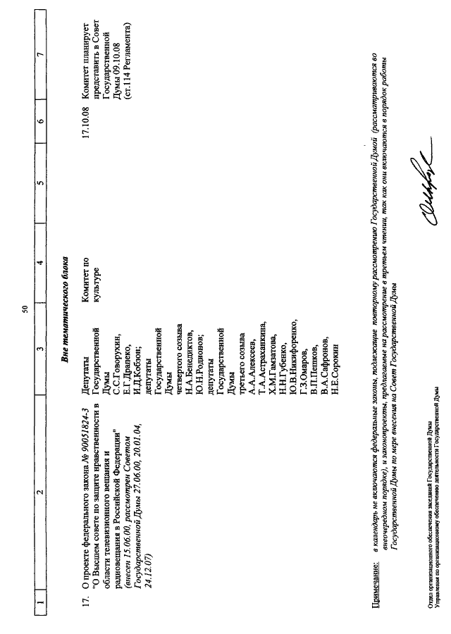 "О КАЛЕНДАРЕ РАССМОТРЕНИЯ ВОПРОСОВ ГОСУДАРСТВЕННОЙ ДУМОЙ С 1 ПО 17 ОКТЯБРЯ 2008 ГОДА"