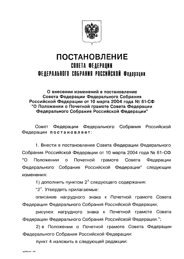 N 61-СФ "О ПОЛОЖЕНИИ О ПОЧЕТНОЙ ГРАМОТЕ СОВЕТА ФЕДЕРАЦИИ