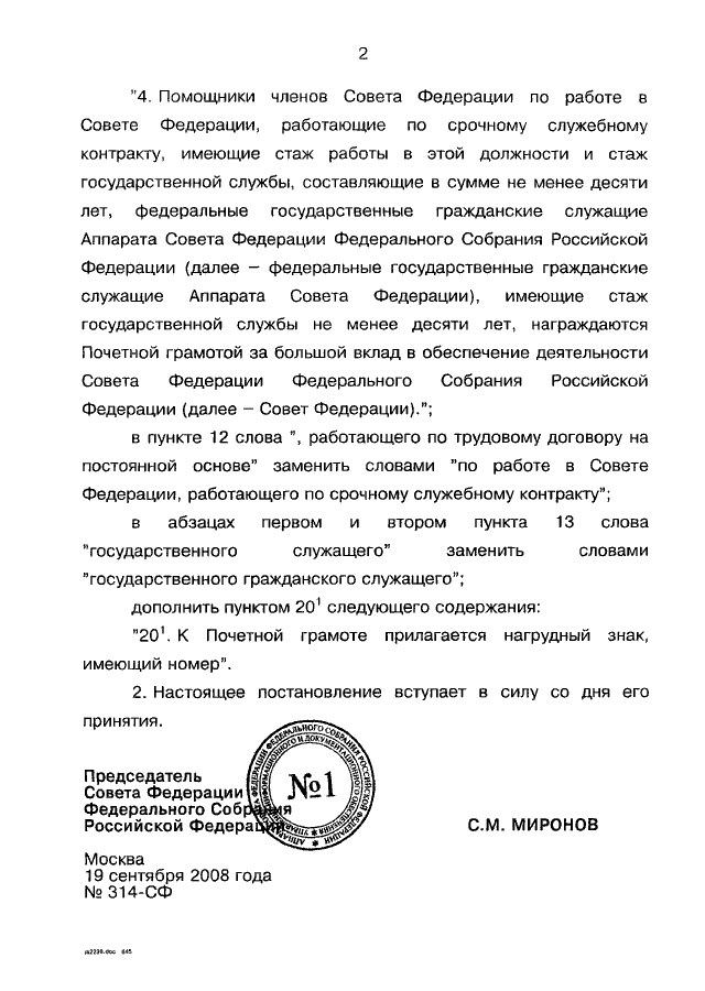 ПОСТАНОВЛЕНИЕ СФ ФС РФ от 19.09.2008 N 314-СФ