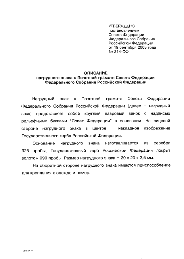 ПОСТАНОВЛЕНИЕ СФ ФС РФ от 19.09.2008 N 314-СФ