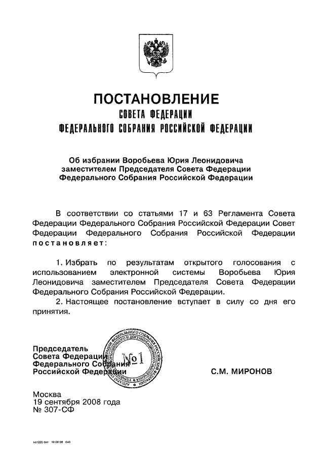 "ОБ ИЗБРАНИИ ВОРОБЬЕВА ЮРИЯ ЛЕОНИДОВИЧА ЗАМЕСТИТЕЛЕМ ПРЕДСЕДАТЕЛЯ СОВЕТА ФЕДЕРАЦИИ ФЕДЕРАЛЬНОГО СОБРАНИЯ РОССИЙСКОЙ ФЕДЕРАЦИИ"
